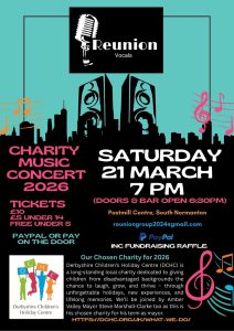 Saturday 21st March – join us for a fantastic evening of live music while helping give disadvantaged Derbyshire children the chance of a seaside holiday they will never forget. Reunion Vocals are hosting a Charity Music Concert on: